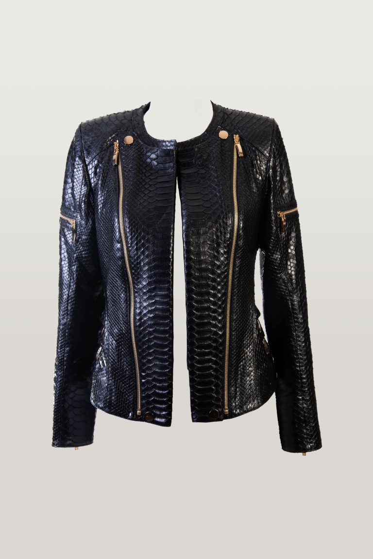 This biker jacket is one of the biggest Ladyboss highlights. Through the black color of the Python skin, the jacket is getting not only a classic, but as well an elegant and sportive look. The two golden zips are an absolute eye-catcher. The lining is satin.