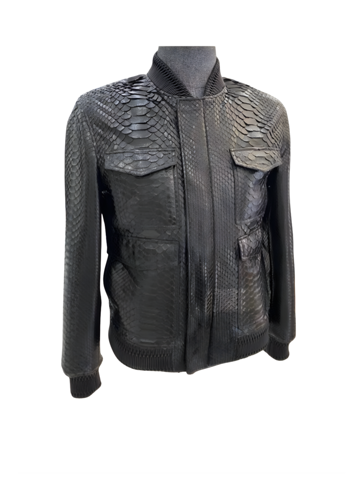 Exklusive Herrenjacke aus echtem Pythonleder in edlem Tiefblau. Die klare, maskuline Silhouette mit Stehkragen und feinen Metallzippern verbindet Luxus und Modernität. Ein markantes Statement-Piece für höchste Ansprüche und zeitlose Eleganz.