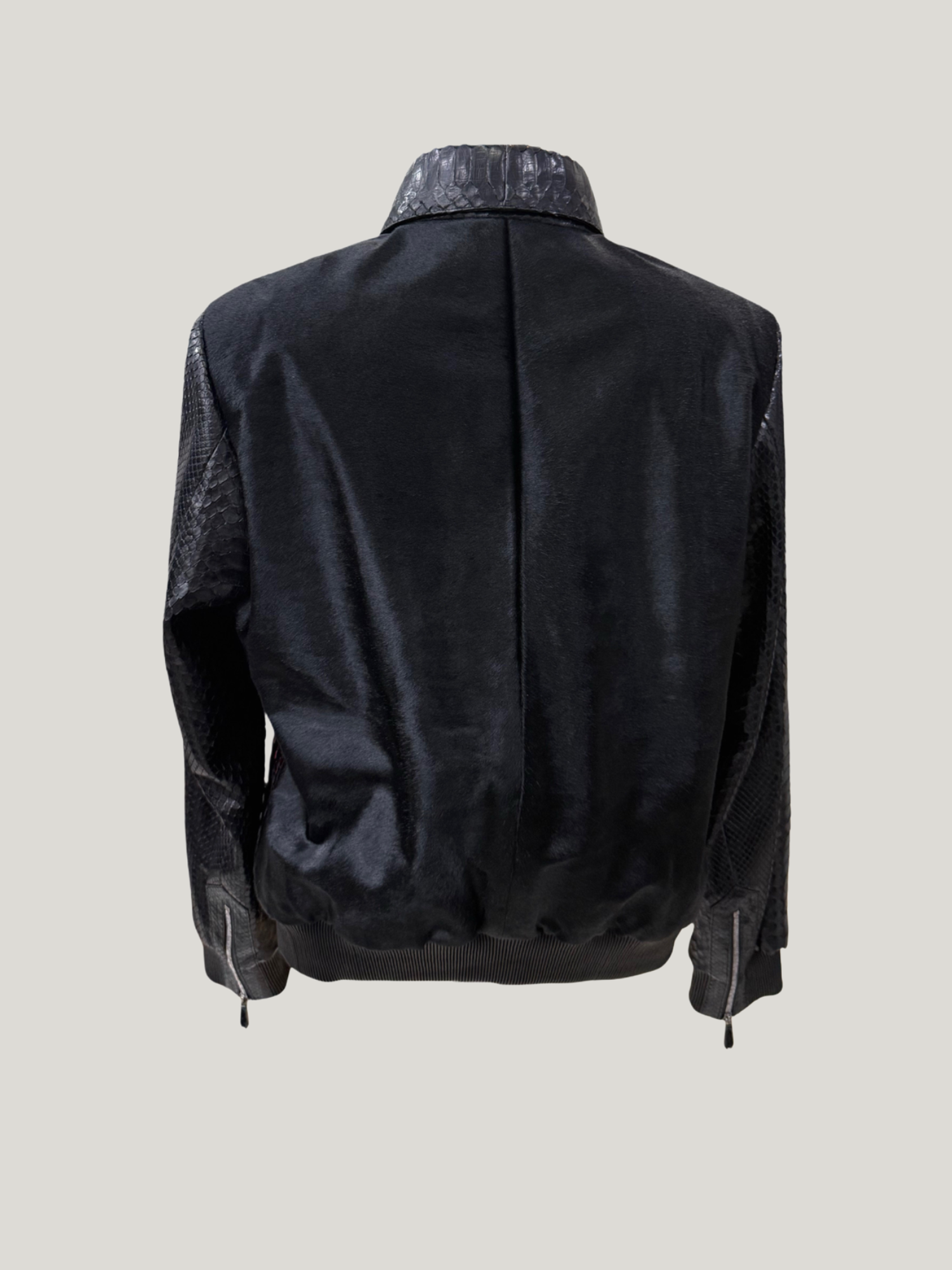 The back is made from high-quality, natural cowhide, offering a soft feel and a fascinating contrast. A sturdy zipper, side pockets, and refined detailing on the sleeves complete the design.