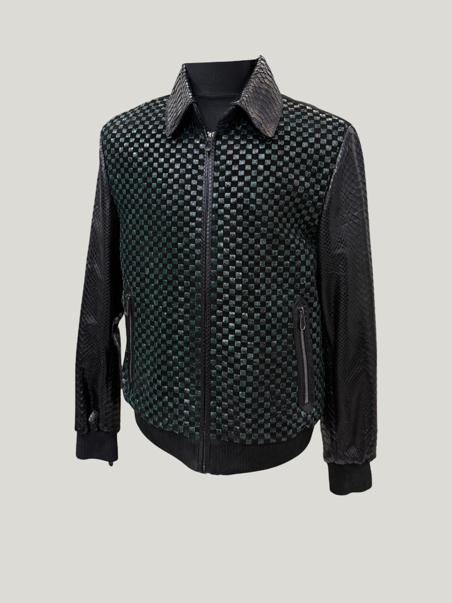 The front showcases meticulously processed python leather in a striking red-black pattern that immediately catches the eye. The sleeves and collar are also crafted from fine python leather, adding a luxurious touch to the piece.