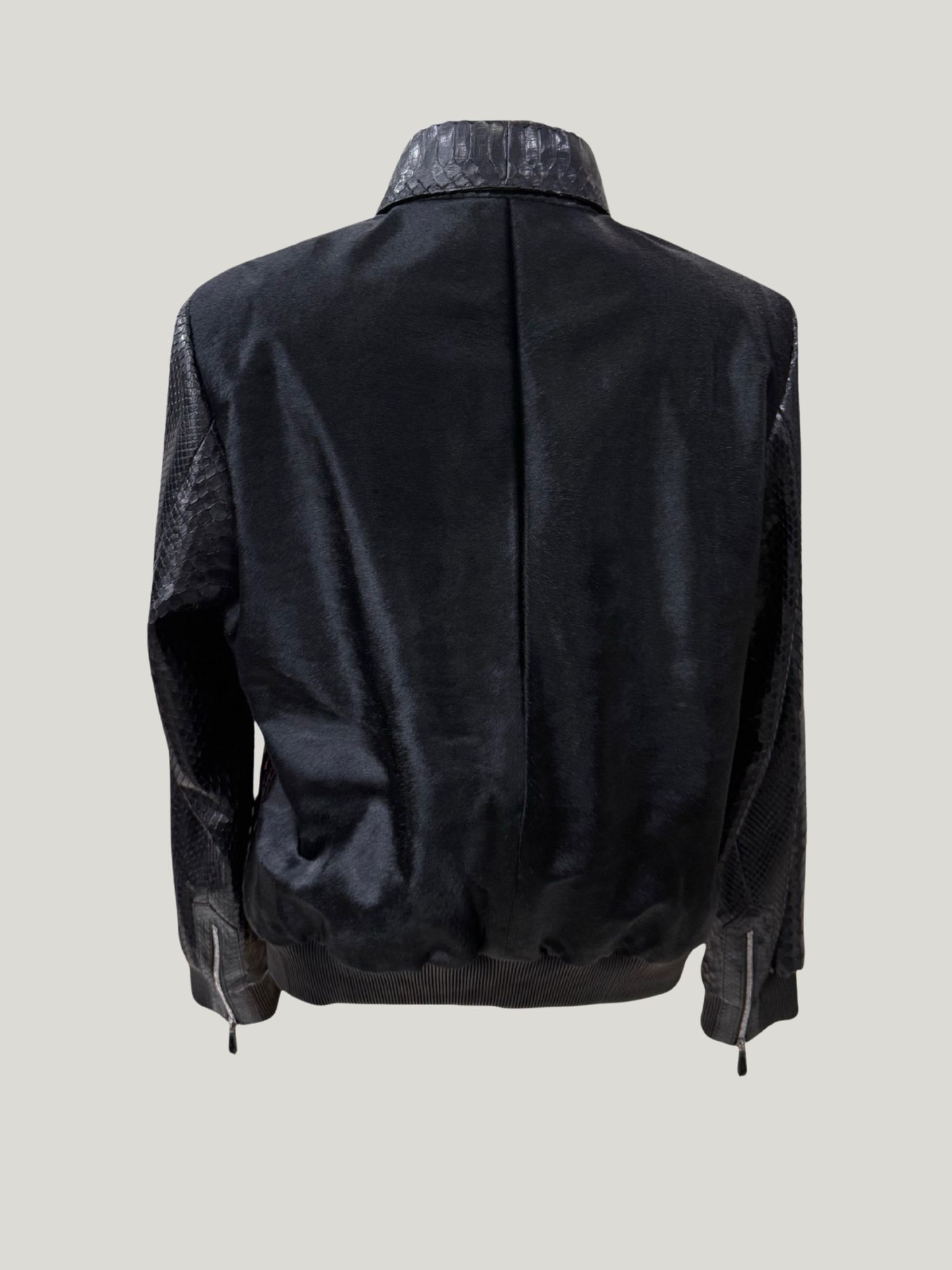This exceptional jacket combines masterful craftsmanship with a unique blend of materials. The front features intricately processed python leather in a striking red-and-black pattern that immediately captures attention. Sleeves and collar are crafted from fine python leather, adding a touch of luxury.